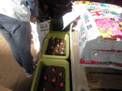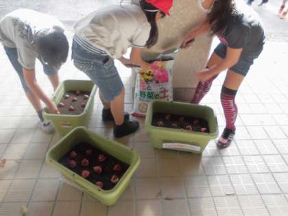 昼休みに、環境・美化委員会がプランターにチューリップの球根を植え付けました。