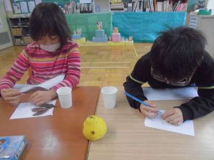 教室に戻って、机の上にそれらを並べて白い用紙にスケッチをしてみました。