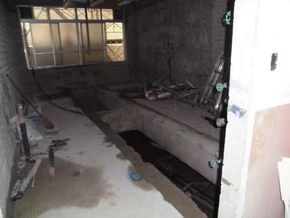 ご覧の通り、これまで使用していた古い便器や手洗い、壁などは解体されて運び出され、現在は、床面がくり抜かれて配管も撤去された状態です。