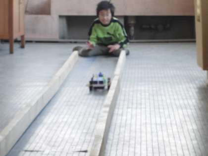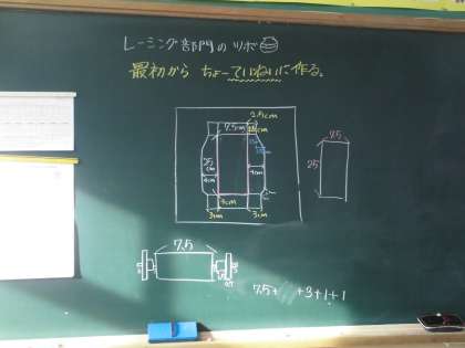 ・黒板の設計図を見て車のボディーの組立て・装飾に励んでいる人
