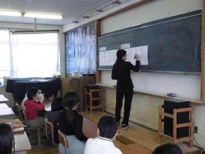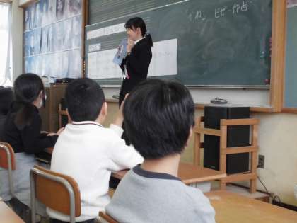 5時間目、3年2組の音楽の授業に、他校からたくさんの先生が授業の見学に来られました。