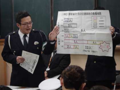 保護者の方にはふれあいサロンに集まっていただき、学校長の挨拶と学校生活の様子を栄養教諭・養護教諭などが説明、山科署・交通課から警察官2名をお招きして、登下校時の交通安全についてお話を聞いていただきました。