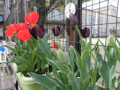 真っ赤なチューリップに交じって、黒むらさき色の珍しい品種も登場!