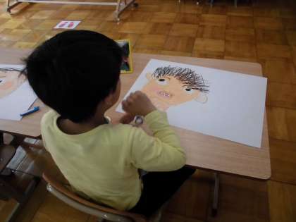 図工の時間に自分の顔を描きました。鏡を見たり,写真を見たりして自分の特徴をとらえながら描きました。一つ一つ丁寧に指示を聞いて描いていました。
