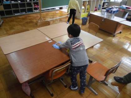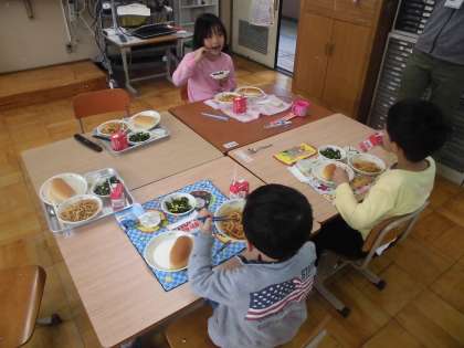 待ちに待った給食開始!!みんな大好きミートスパゲッティー♪口の周りについたミートソースを見てニコニコ笑顔になりました。給食の後,進んで台ふきしてくれた1年生!!ありがとう。