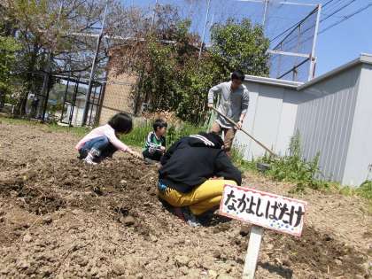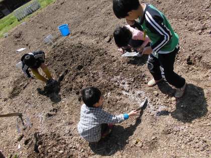 畑の手入れをしました。地域の方がきれいにしてくださった畑に肥料を混ぜ,土づくりをしました。少し匂いがきつく,大変でしたが頑張りました。枝豆やピーマン,トマト,スイカなどを育てる予定です。