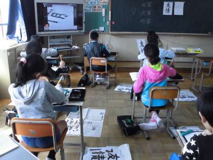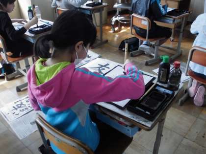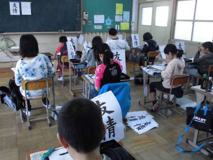 今日の1、2時間目は習字をしました。始筆、送筆、終筆に注意して「友情」という字を書きました。静かに集中して書けました。