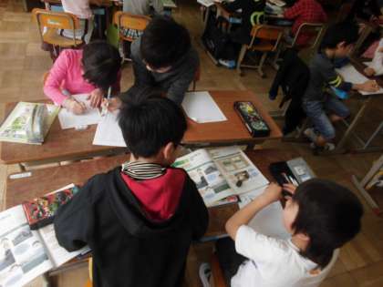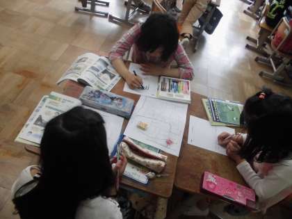 社会科の学習で3年1組に交流学習にいきました。西野小学校の校区にはどんな店や施設があるか,しょうかいカードに書きました。まだまだ知らない西野小学校区のひみつが見つかるかも……!?