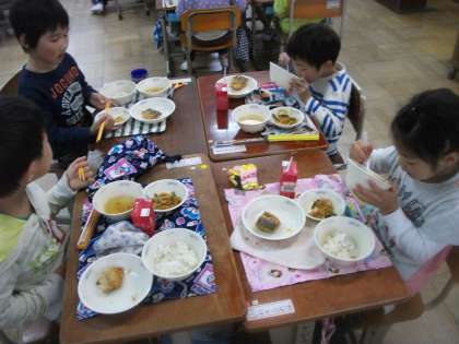 1年生は今日をいれて給食を6回食べていますがもりもりとごはんもおかずも残さず食べています。