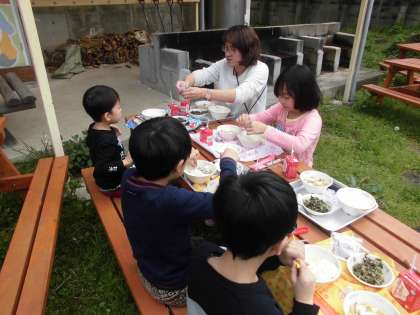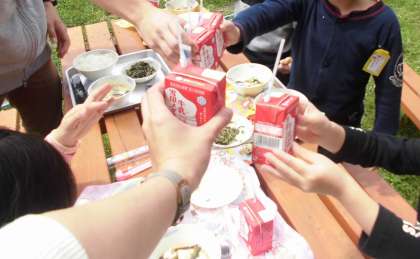 今日はお天気がよかったので,ビオトープで給食を食べることにしました。お誕生日だったお友達をお祝いしてカンパ〜イ♪ぽかぽか陽気が気持ちよく,おいしくいただきました!!