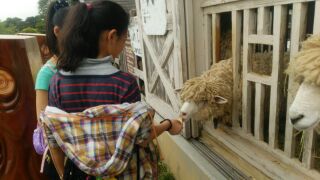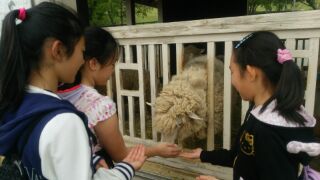 エサをあげたりなでたりして触れあっています。