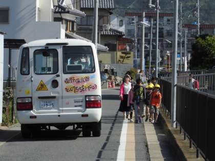 今朝も登校指導のご協力ありがとうございます。通学路には、数台ですが登校時間帯に通行許可を得ている車両が徐行運転しております。