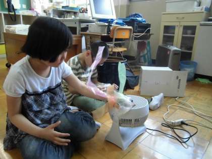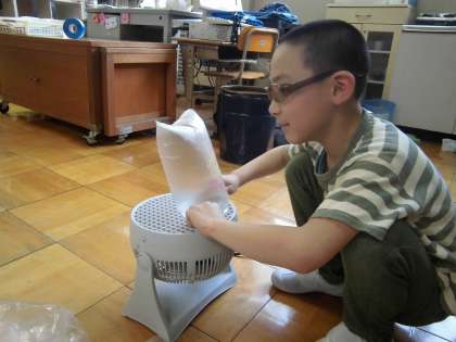 身近な材料,ビニール袋を使って工作をしました。送風機を使い,風の力をうまく利用しながらおもしろくなる工夫をしました。ふわふわと舞い上がるのが楽しくて,何回も飛ばしました。