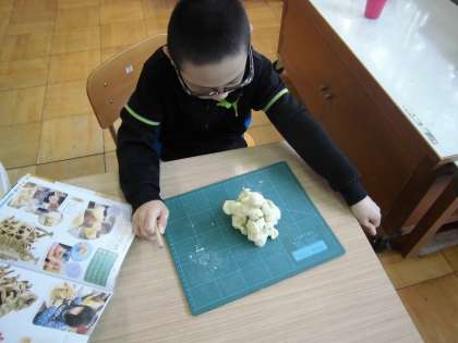 3年生は図工で粘土のかたまりを切り糸で様々な形に切ったり,かきべらでけずったりして,切り口やけずり後の形を楽しみながらつくりました。