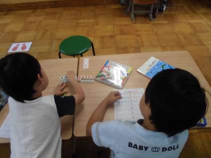 数図ブロックで2つの数字にわけて「…と…,あわせて…」と学習しています。