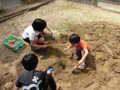今日は砂場で砂遊びをしました。お山を作って穴をあけて水を流したり,型に砂を入れてプリンを作ったりと砂とたくさんふれあい楽しみました。