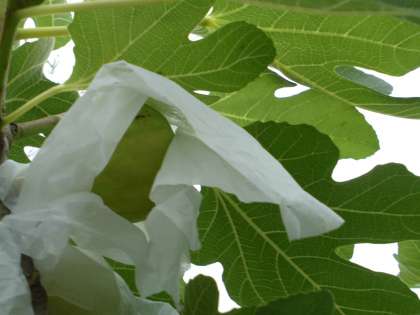 これから実がさらに熟してくると鳥がやってきて実をつつくので,白いカバーをかけて防護しています。