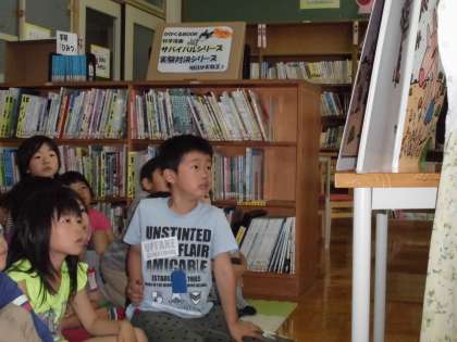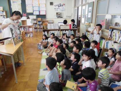 記事が前後しましたが,中間休みは図書室で図書ボランティアのお母さん方による「絵本の読み聞かせ」です。