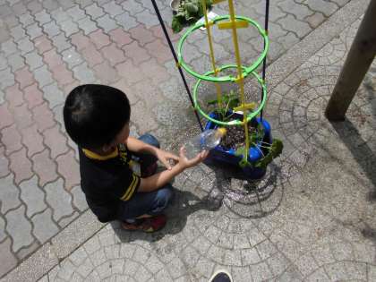今日はすくすく育ったあさがおを2つに選別しました。支柱もたてて,これからもぐんぐん伸びていきます。