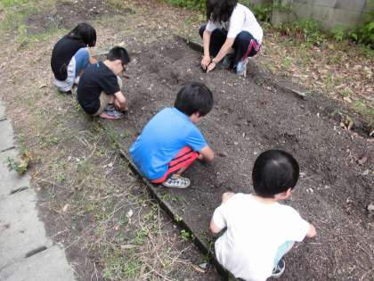 種イモから育てるので少し深く土を掘るので,頑張って掘って植えていました。