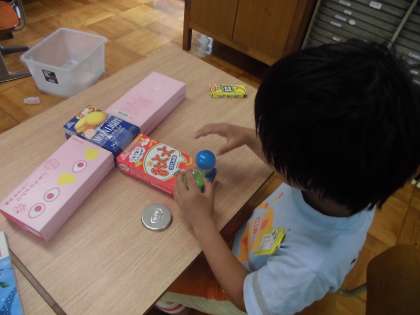 今日は箱などを使って立体物を作りました。図形の特徴をとらえたり形の機能に着目しました。