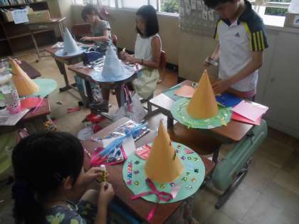 今日の3,4時間目は図工で「わっかでへんしん」をしました。前回つくった帽子に折り紙や紙テープ,リボンで思い思いに飾りつけをしました。飾り付けて,被って,飾り付けて…集中して取り組むことができました。