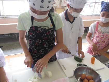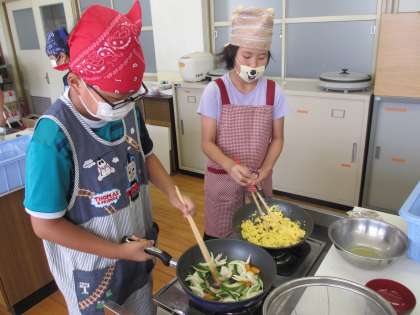 15日,6年生になって初めての調理実習をしました。野菜のいろどり炒めとスクランブルエッグを作りました。