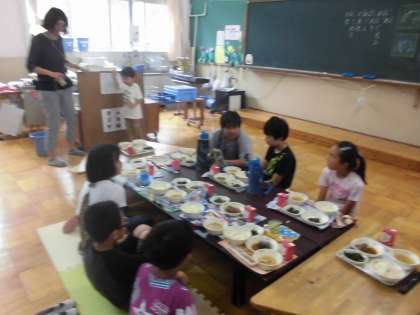 今日から交流給食が始まりました。最初は6年1組のお兄さん,お姉さんたちがつくし学級に来てくれました。お互いに名前と好きな食べ物を自己紹介して楽しく給食を食べました。