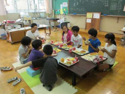 6月28日から班ごとにつくし学級へ交流給食をしに行っています。自己紹介をしたり,好きなものを質問したりして,つくし学級の4名のお友達と交流を深めています。