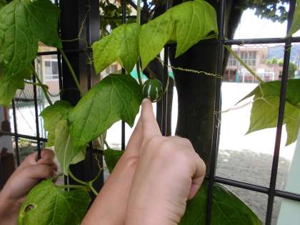 一方では,「琉球スズメウリ」がまるでスイカのような小さな実をたくさん付けて,観察にやって来た1年生やつくし学級の子どもたちの人気者になっていました。