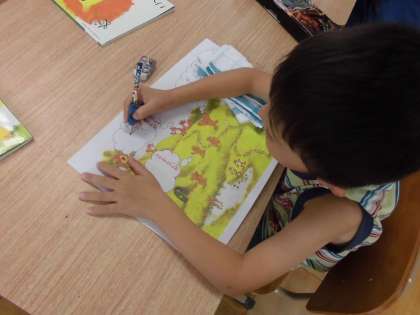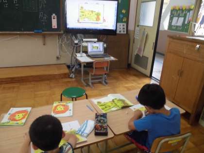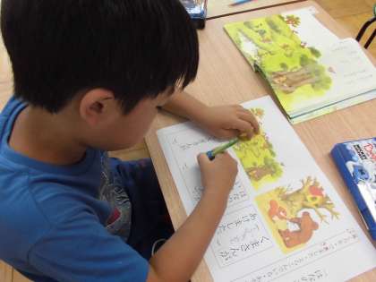 国語では「はなのみち」というお話を読んでいます。挿絵を見て,登場している動物の気持ちや考えを文にしています。