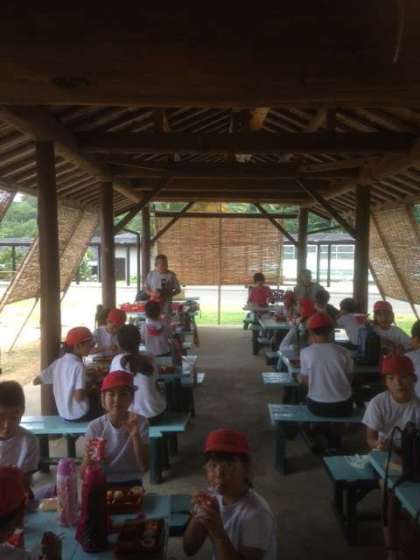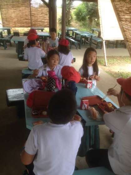 あずま屋のテーブルで朝食‼︎