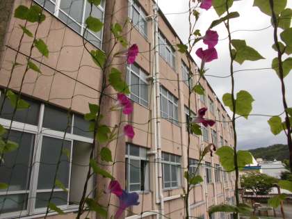 南北の校舎をつなぐ渡り廊下を囲むようにスクスクとツルを伸ばしていた「西洋アサガオ」がようやく開花を迎えました。