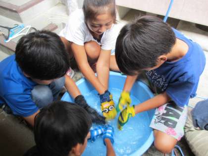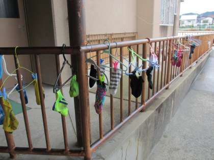 家庭科の「夏をすずしくさわやかに」の学習で,靴下を手洗いしました。子どもたちは10分以上時間をかけ,靴下を丁寧に洗っていました。風に揺れている靴下が気持ちよさそうです。