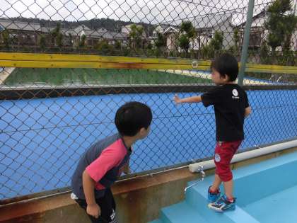 今日は,天気も良く,涼しい風が吹いていました。今日は学校の中の小さな秋を探しに行きました。ワンダフルワールドをめぐり,プールを見に行きました。夏には毎日通っていたプール。「プールが緑になってる!」,「鳥がとまってる!」と発見していました。