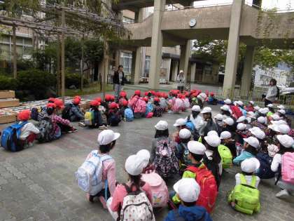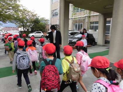 今日は秋の遠足。朝からウキウキで登校してきた子どもたち。1・2年生で滋賀県の皇子ヶ丘公園に向かいます。朝の挨拶もしていよいよ出発です。