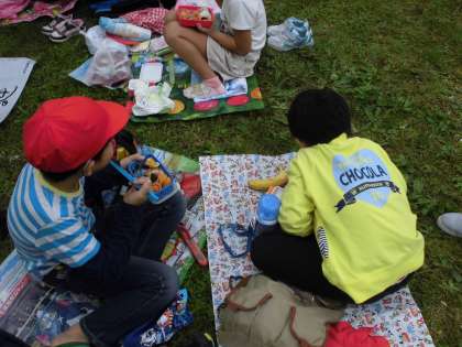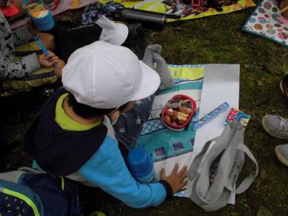 たくさん動いておなかもペコペコ。待ちに待ったお弁当タイム!もぐもぐパクパク。おいしいお弁当をしっかり食べていました。