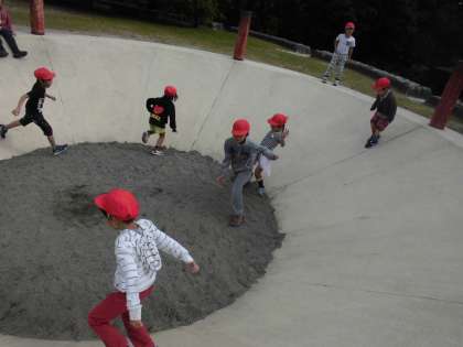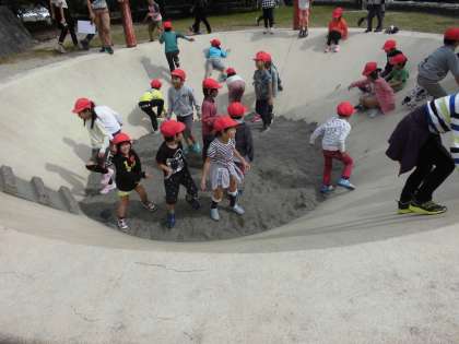 荷物を置いて,たてわり班で遊びました。赤組は先に遊具とありじごく,白組は先に川遊びをしました。写真は,ありじごくで遊んでいる子どもたちの様子です。