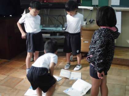自分たちで考えた台本に動きをつけて劇の練習をしました。