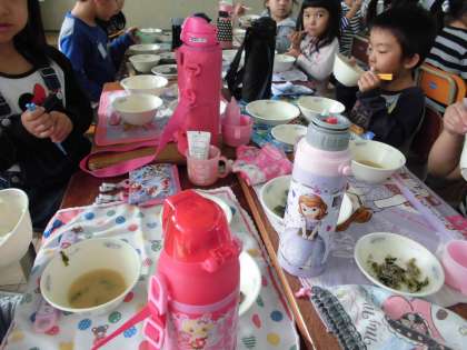 なじみのある味をかみしめながらみんなで楽しく給食を食べていました。