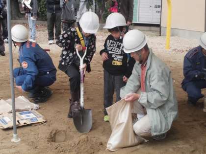 本校児童も「土嚢(どのう)づくり」や「心臓マッサージ」にチャレンジしていました。