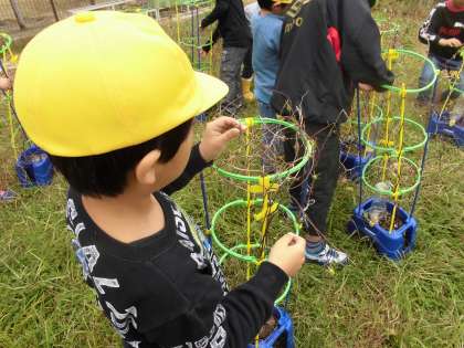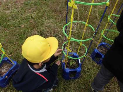 生活科の「あきといっしょに」の学習のまとめとして,1年2組のみんなと一緒に今まで育ててきたアサガオのつるを使ってリース作りをしました。つるを支柱から離すのも一苦労。頑張ってつるをまとめていました。