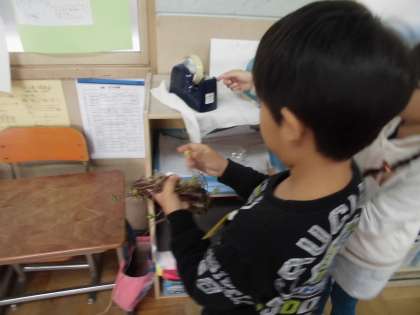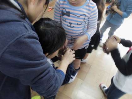 教室に戻ってリース作り。つたを協力してクルクルまいてリースの形にしていきます。協力して素敵なリースを完成させていました。これから秋の飾りをつけてさらに素敵なリースにしようと思います。
