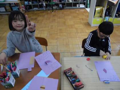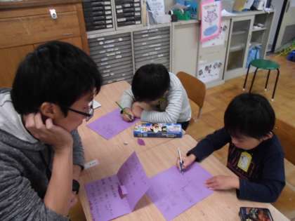 18日においもパーティーを計画しています。今日はパーティーにむけてのお誘いする学校にむけて招待状を書きました。「おいもパーティーにきてね」やプログラムなどを丁寧に書くことができていました。