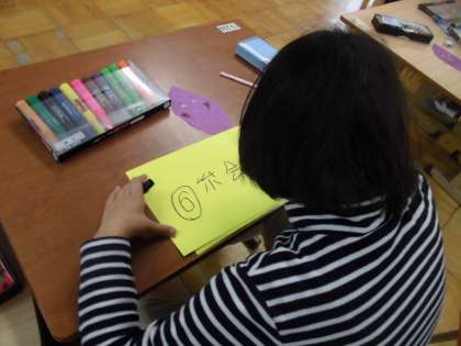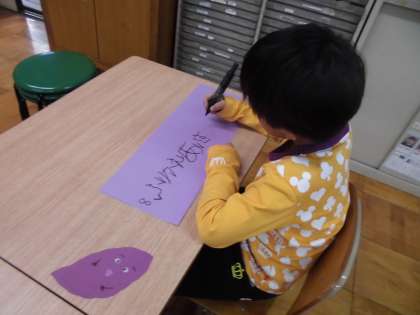 おいもパーティーにむけて,今日は学習の流れをみんなで確認し自分たちで書きました。書いたものの隣にはかわいい「おいもちゃん」を張り付けました。みんな丁寧に読みやすいように書いていました。