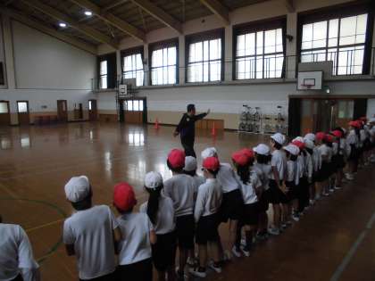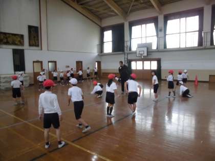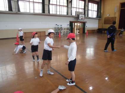 体育館で体ほぐしの運動をしました。じゃんけんに勝つと次の島に進めたり,通過ポイントに鬼がいたり・・・頭も体も使って楽しみました。