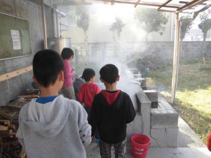 準備ができたら,火の中に入れていきます。お手伝いもしてくれました。