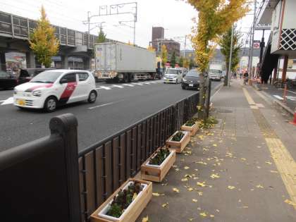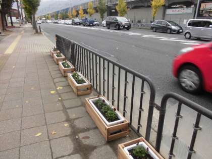 東野交差点付近までの南北の歩道には色とりどりの「ビオラ」のプランターが並べられ,華やかな雰囲気を作り出しています。