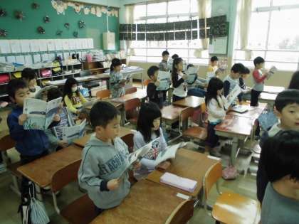 自分の好きな文のところで立って読みながら,みんなで繋げていきます。