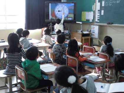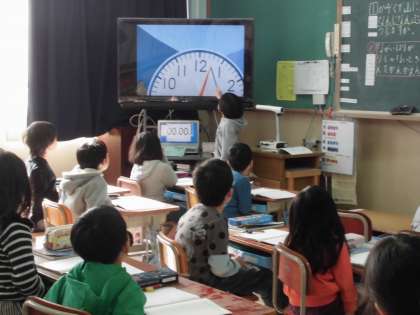 みんなで気付いたことを話し合いながら,時計の1目盛りの読み方について学習しました。